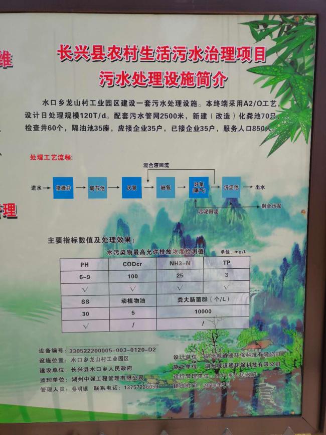 我们在龙山工业园区的生活污水处理工程位于长兴县长达线水口乡龙山村工业园区,服务企业35家,服务人口约850人。污水收集主、支管网总长约2500米,各类检查井60座。污水经处理后达到《农村生活污水处理处理设施水污染物排放标准》(DB33/973-2015)中的一级排放标准。