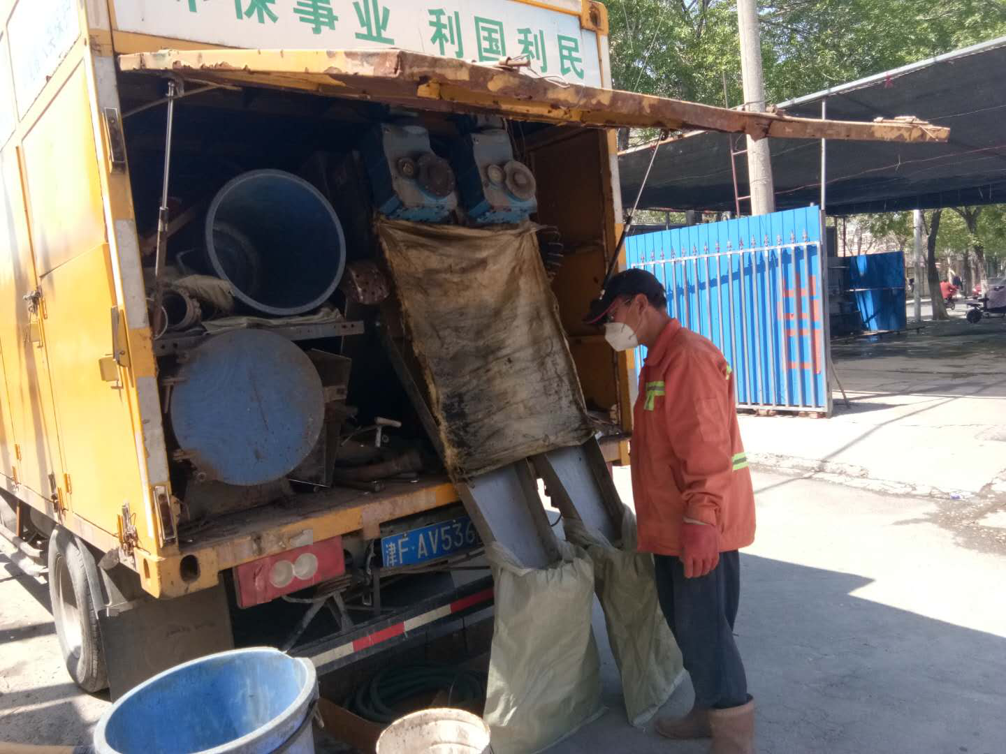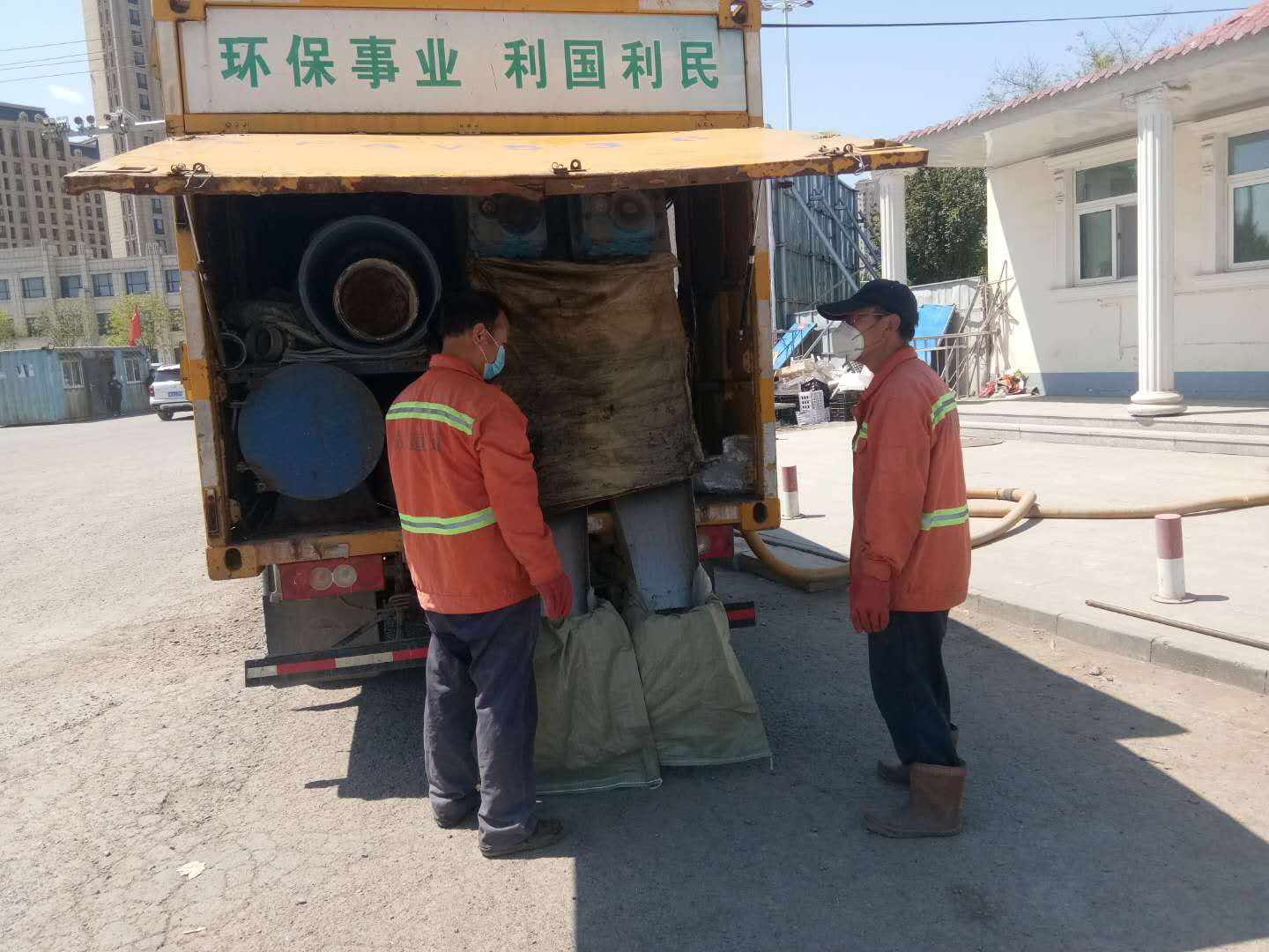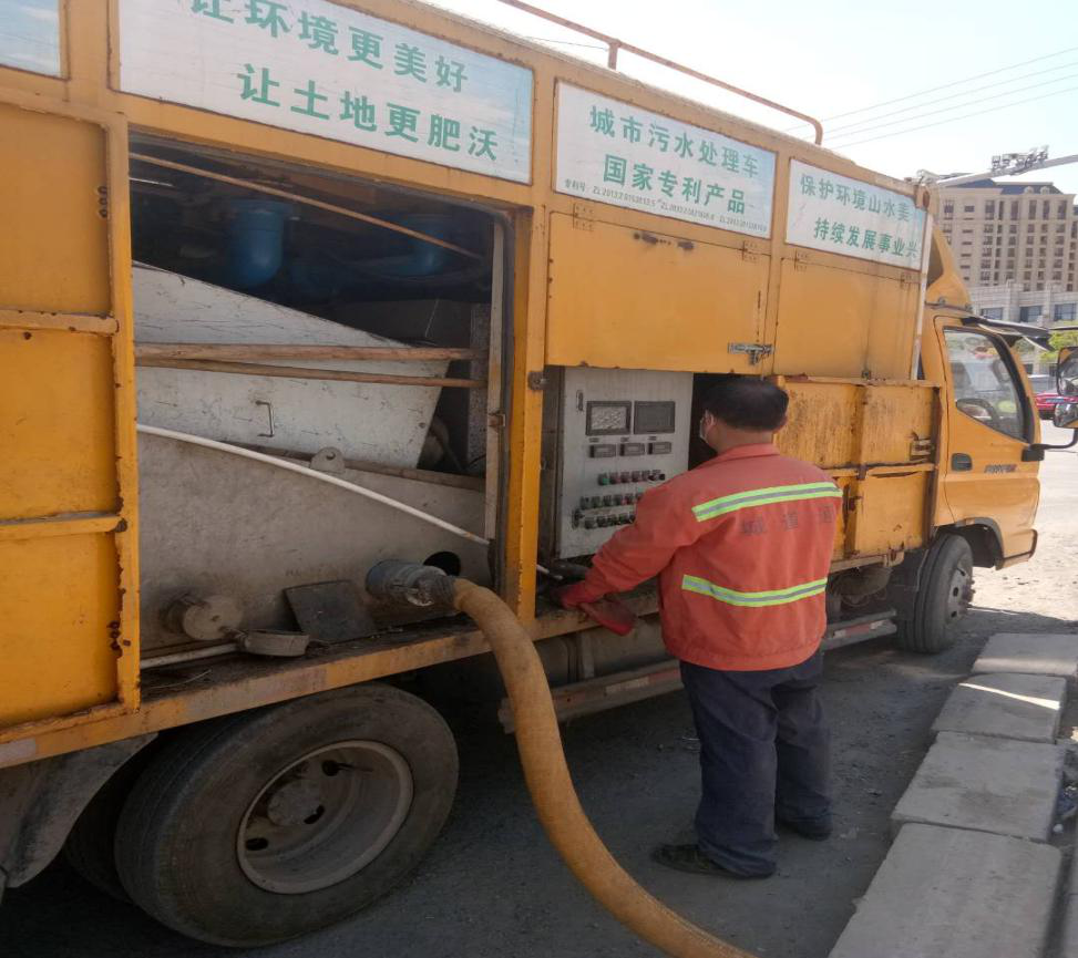 天津市宁河区公厕作业中,无害化处理车处理中。