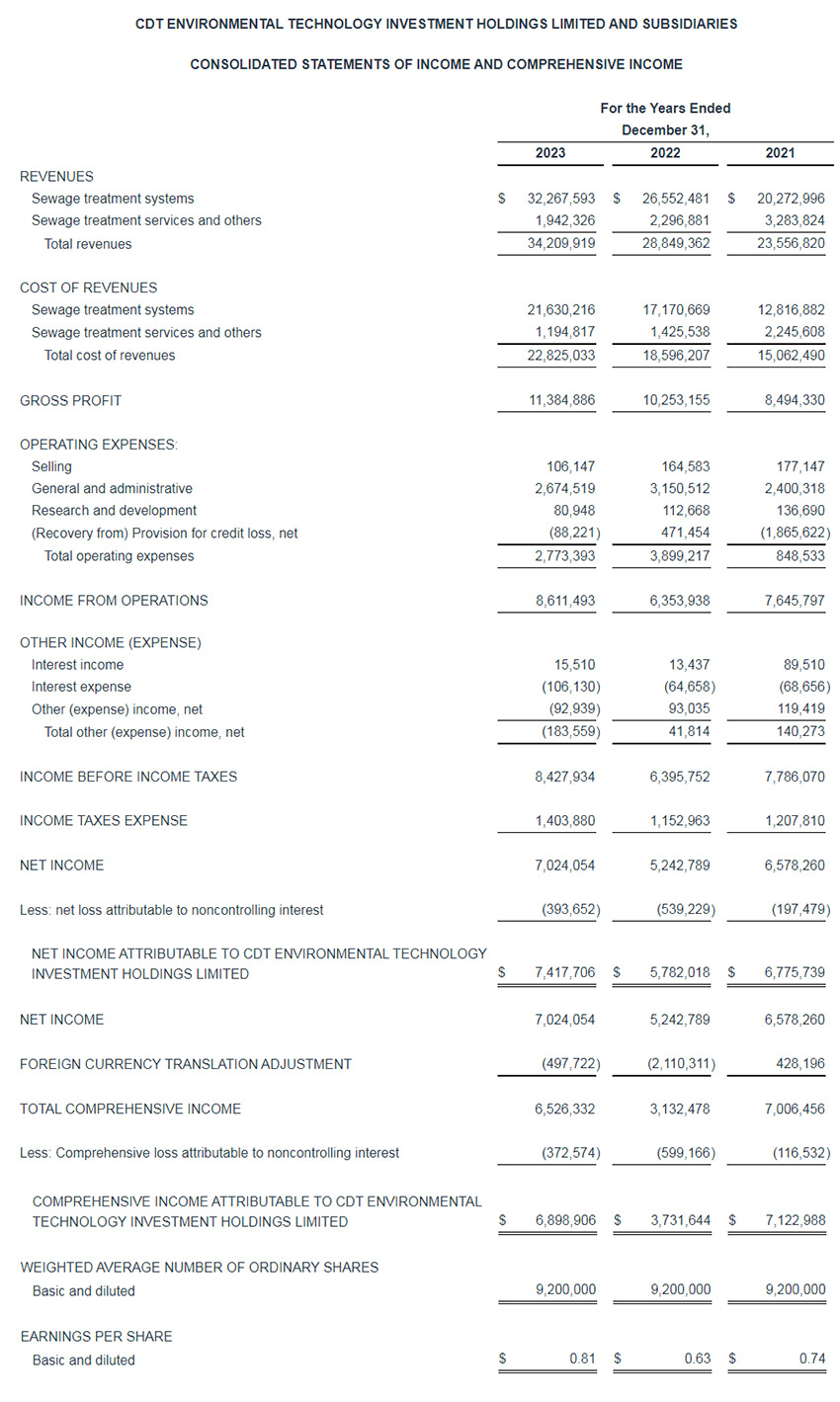 “Following our IPO just a few weeks ago, we are pleased to report our third consecutive year of growth at both the top- and bottom-lines, with fundamentals continuing to trend well for our shareholders,” remarked Yunwu Li, Chief Executive Officer of CDT. “The market demand continues to support the growth of our business, and indeed, we are proud of the consistent progress we have made since the lifting of COVID-19 related operating restrictions throughout our key markets. Sales, gross profit, and net profit, our key performance indicators all were higher, and reflect excellent execution from our team, as we complete existing projects and add on new projects. Sewage treatment systems revenue was up over 20% for the year, and our two largest projects, in Lianjiang and Wuyishan are progressing through Phase 2, collectively with approximately $23.2 million in contract revenue to be recognized in coming quarters. With new projects coming on-line, including the $11.7 million contract with a partner in the Jianyang District of Nanping City, China, and new technological advancements we’re introducing to the waste treatment market, we are excited about the future for our company,” concluded Mr. Li.