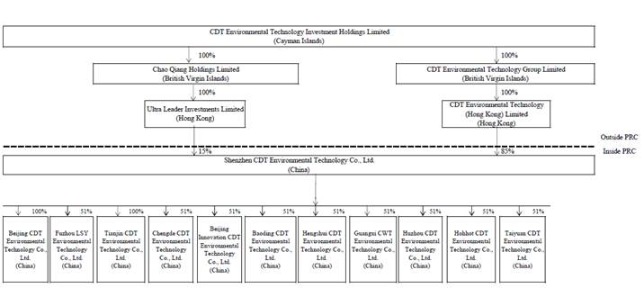 CDT BVI is a holding company holding all of the outstanding equity of CDT Environmental Technology (Hong Kong) Limited, or CDT HK, which was established in Hong Kong on July 30, 2015. CDT HK is also a holding company holding 85% of the outstanding equity of Shenzhen CDT. We, through Ultra HK and CDT HK, hold 100% of the outstanding equity of Shenzhen CDT. Shenzhen CDT holds equity interests in the PRC subsidiaries noted in the charts in “Corporate History and Structure”.